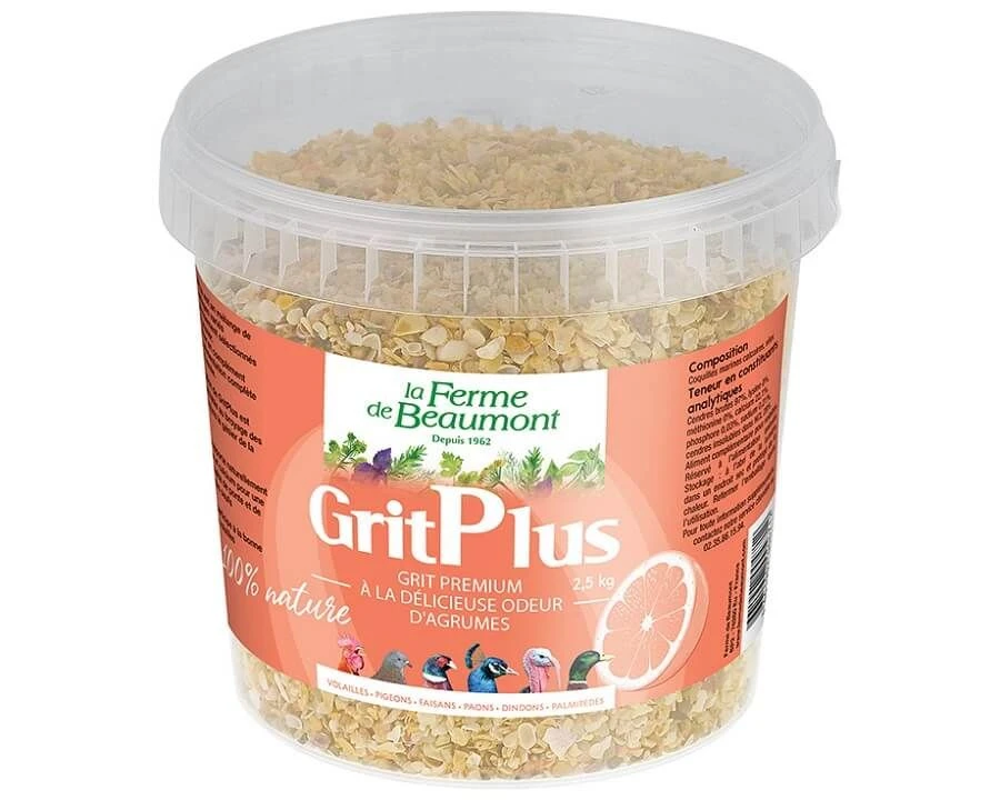 GritPlus est un mélange de coquillages variés et de gravier qui va aider au broyage des graines et aliments. Son odeur agréable d’agrumes va donner envie à vos poules et volailles. Il s’agit d’un grit premium avec des produits soigneusement sélectionnés, de qualité supérieure afin que l’efficacité soit renforcée.