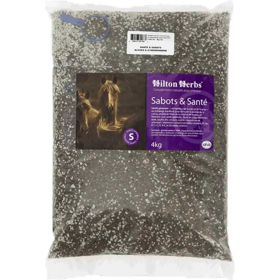 Sabots et Santé est un complément sec à base d’algues et de cynorrhodon riche en minéraux : iode, soufre, fer, calcium, cuivre, magnésium et sélénium ainsi que des acides aminés, des vitamines (B1, B2, B12, C, et E) et du bêta-carotène. Des recherches ont prouvé qu’une alimentation équilibrée contribue au développement de sabots sains et au bien-être général.