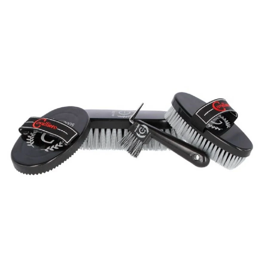 Le sac Cavalliero contient une étrille en plastique, un bouchon, une brosse douce et un cure-pieds assortis pour prendre soin de la robe et des sabots de votre cheval.