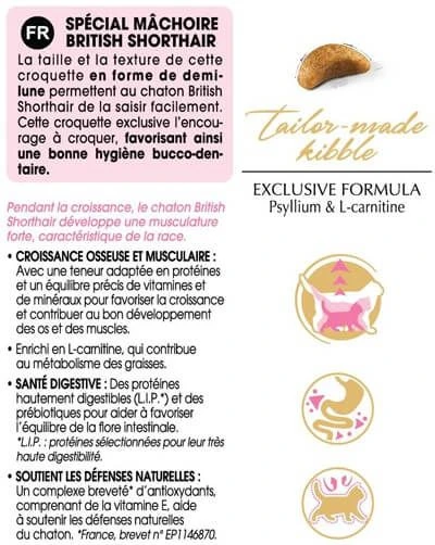 KITTEN BRITISH SHORTHAIR aide à soutenir une croissance saine des muscles et des os grâce à une teneur adaptée en protéines et à un juste équilibre en minéraux et vitamines. Formule enrichie en L-carnitine.