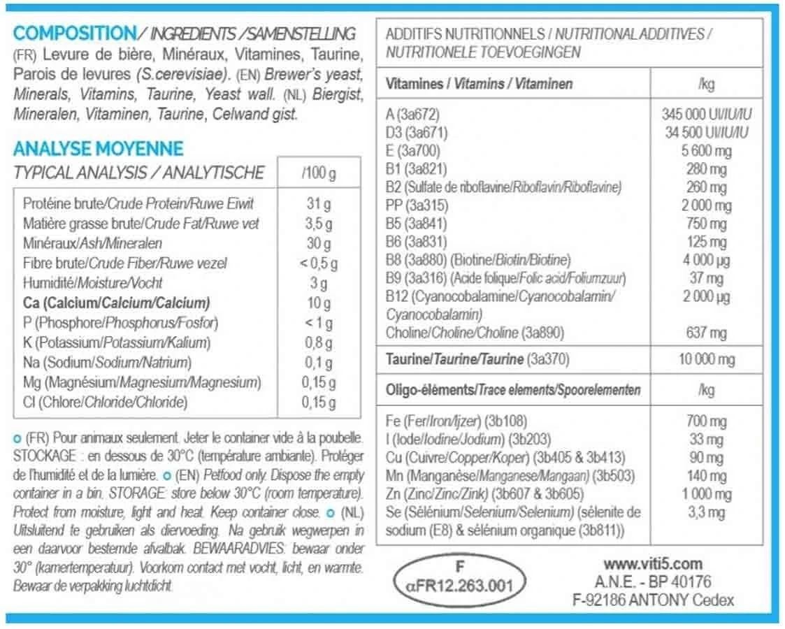 Vit’i5 Bleu est formulé spécifiquement par notre vétérinaire nutritionniste pour équilibrer en minéraux, vitamines et oligo-éléments l’alimentation ménagère des chiens et chats = viande/poisson + Vit’i5 BLEU + huile de colza + légumes +/- féculent.